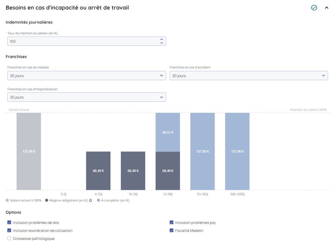 Pour chacun des risques, des % et/ou franchises par défaut sont renseignés. Vous pouvez jouer avec les pourcentages et/franchises afin d'évaluer la prise en charge via la vision des graphiques.-