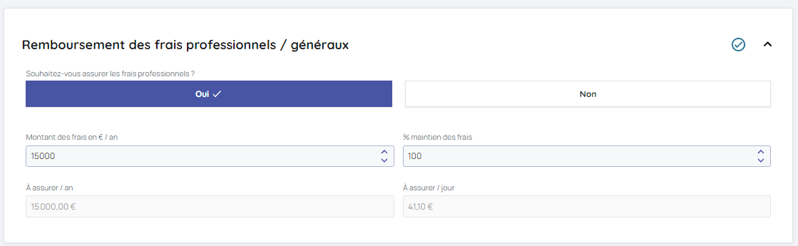 Si vous souhaitez simuler le remboursement des frais généraux, vous devez renseigner le montant des frais à assurer par an et le % du maintien souhaité le système vous calculera le montant de frais à assurer par an et par jour.