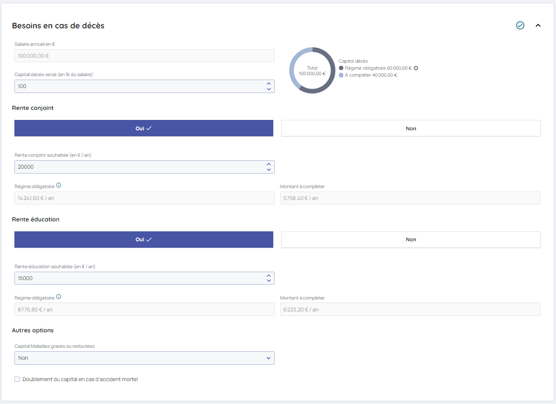 Si vous avez renseigner un conjoint ou un enfant, alors les options Rente conjoint et Rente éducation affichent également les données du RO.