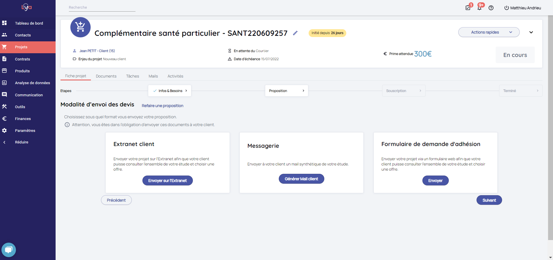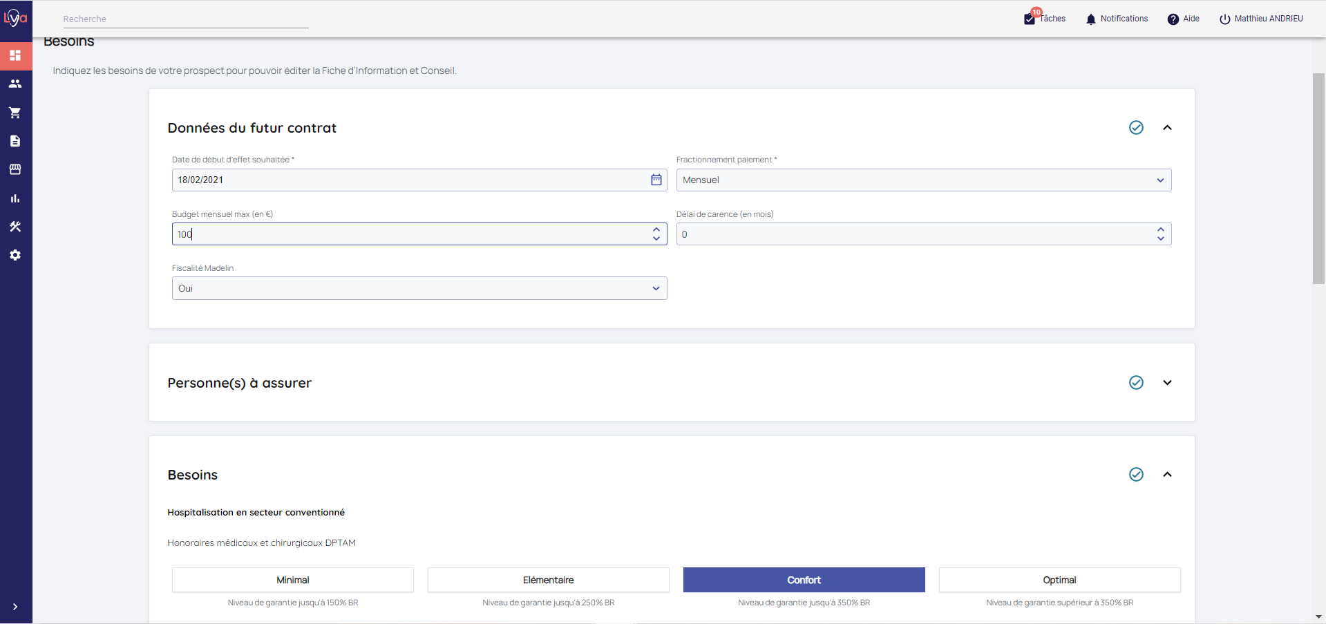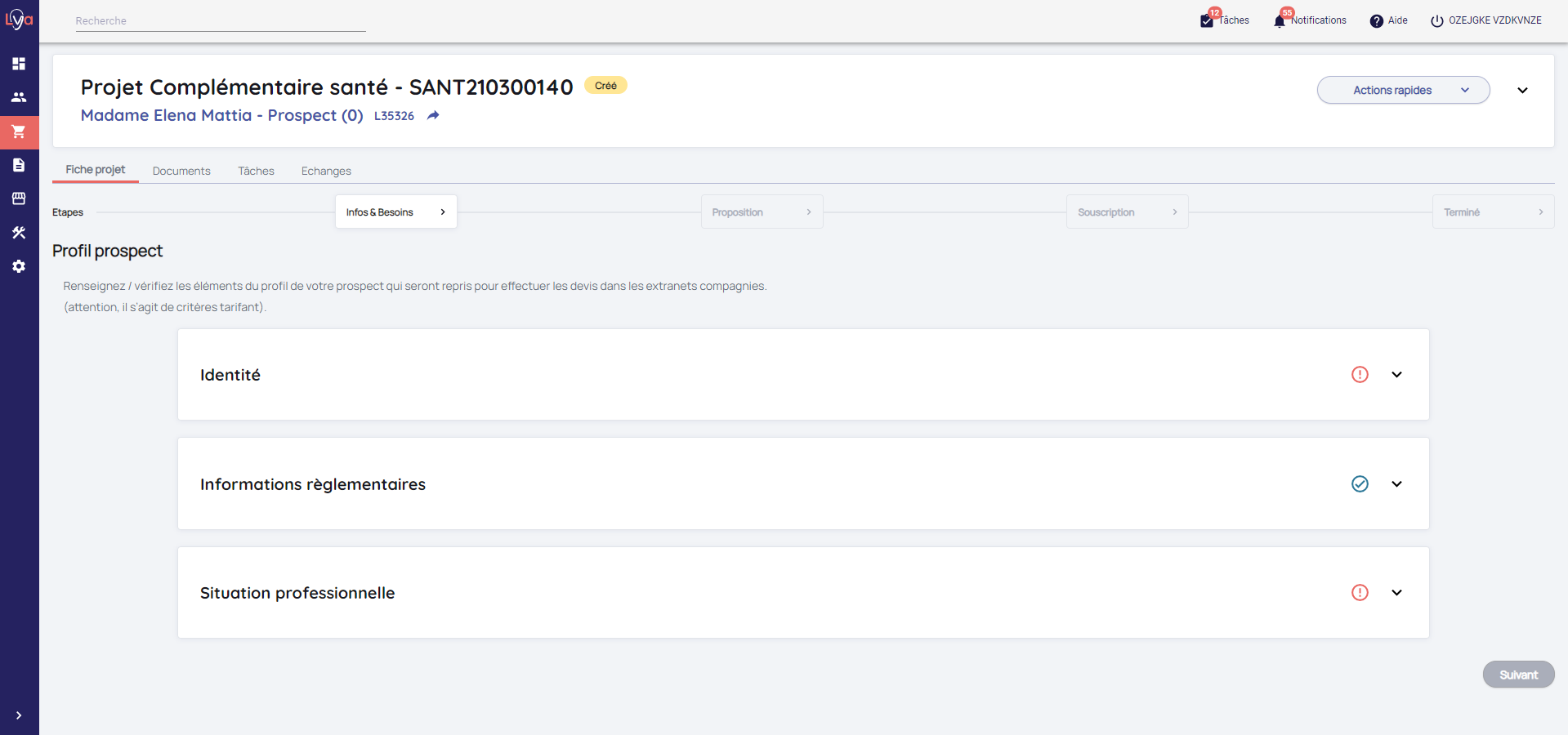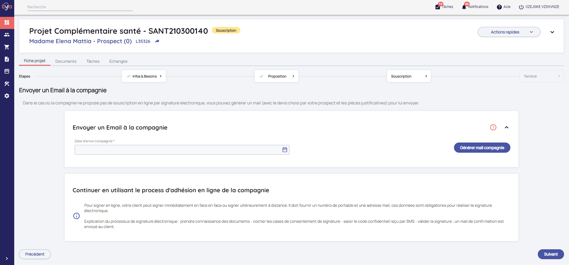 Cette étape consiste principalement à compléter le recueil des besoins qui apparaitra dans la Fiche d'Information et Conseil (FIC) éditée par Lya et seul le fractionnement des paiements est une donnée obligatoire. Ce qui vous permet de passer plus rapidement à la tarification si vous le souhaitez, néanmoins, si vous ne renseignez pas les besoins de votre prospect, la FIC de votre projet sera vide et vos prendrez un risque au niveau de votre devoir de conseil.