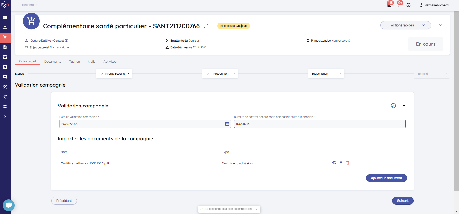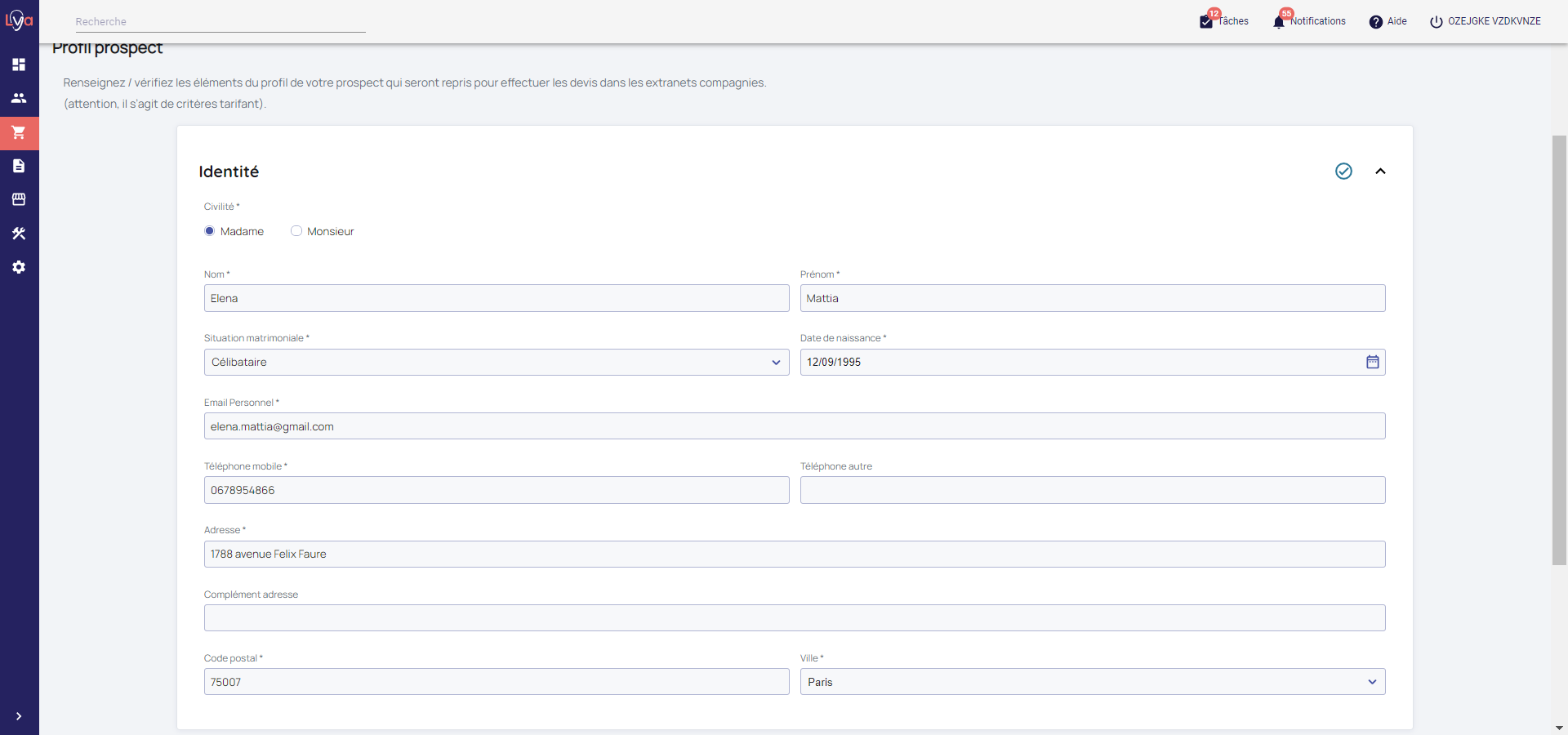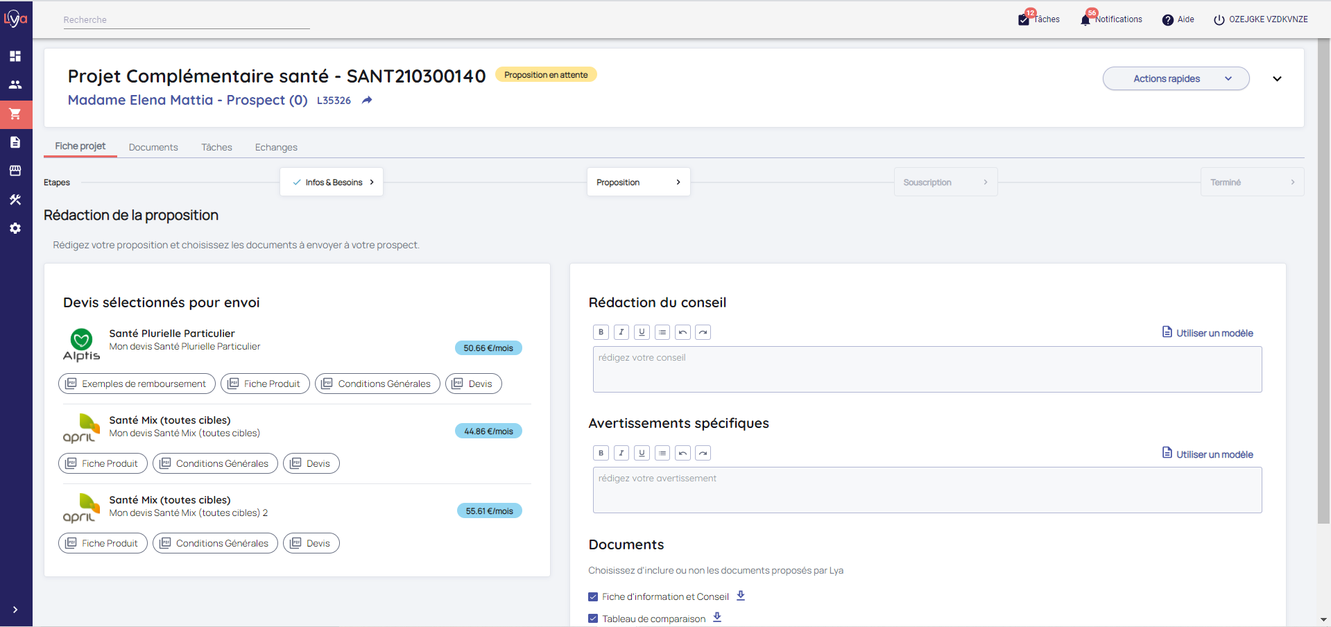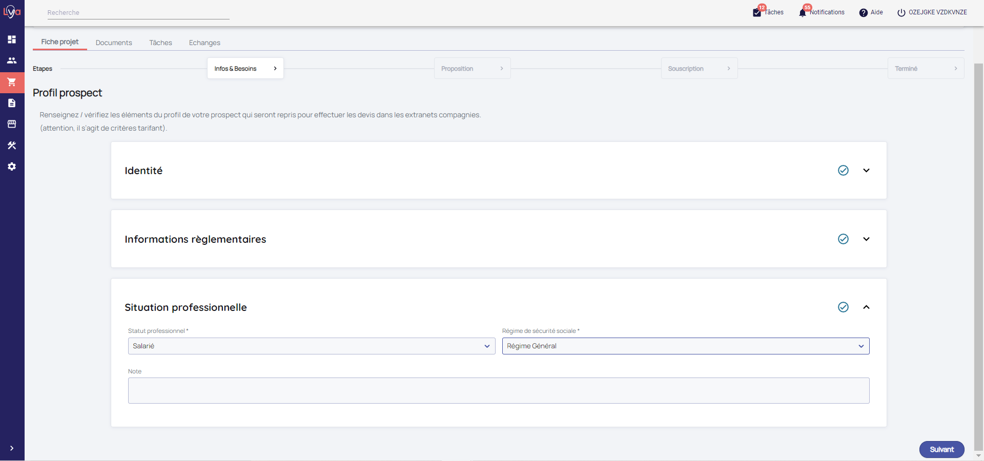 Cette étape consiste principalement à compléter le recueil des besoins qui apparaitra dans la Fiche d'Information et Conseil (FIC) éditée par Lya et seul le fractionnement des paiements est une donnée obligatoire. Ce qui vous permet de passer plus rapidement à la tarification si vous le souhaitez, néanmoins, si vous ne renseignez pas les besoins de votre prospect, la FIC de votre projet sera vide et vos prendrez un risque au niveau de votre devoir de conseil.