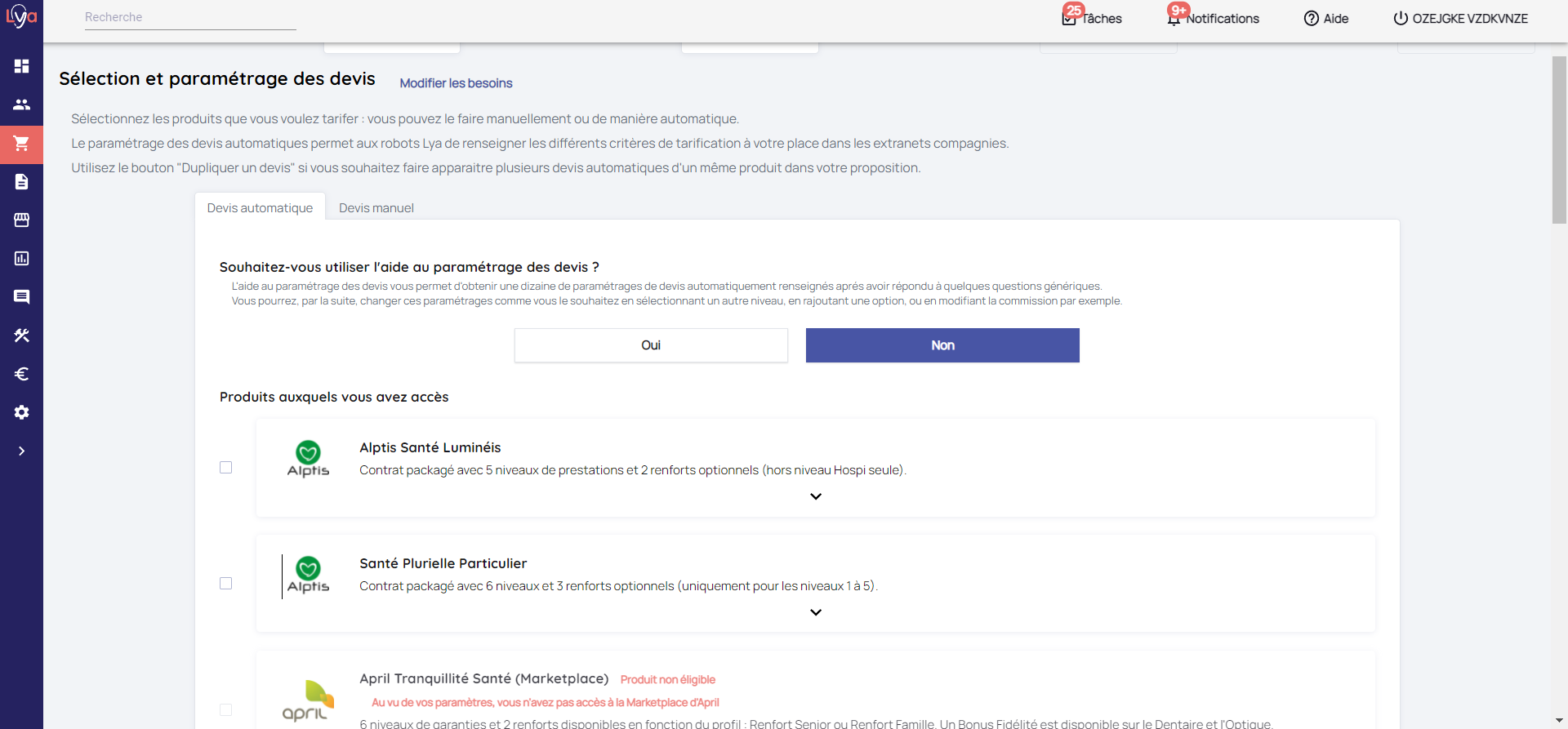 Pour sélectionner les produits pour lesquels vous souhaitez que les robots Lya fassent les devis en automatique, il vous suffit de cocher les produits sélectionnés et de cliquer sur Suivant.