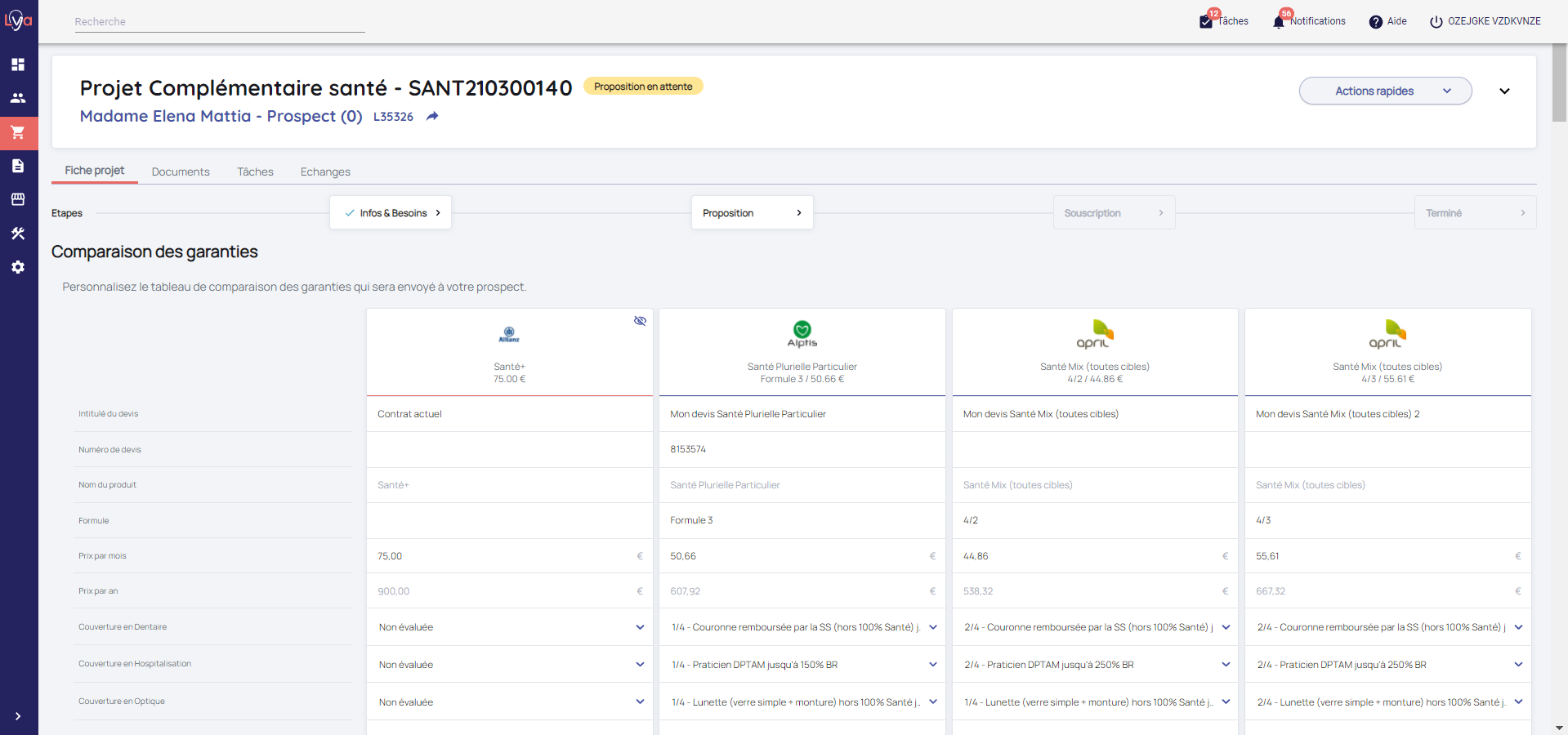Dans cette étape, visualisez et comparez les garanties des devis sélectionnés et du contrat actuel du prospect, si vous en avez sélectionné un.