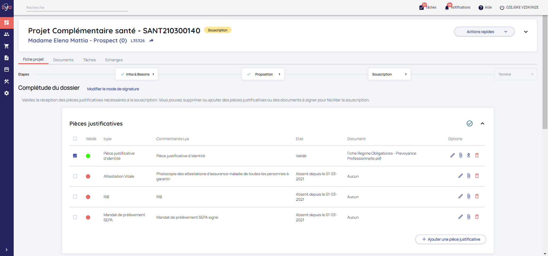 Pour savoir comment signer électroniquement les documents de votre projet, merci de vous reporter à ce FAQ : https://aide.lyaprotect.com/centredaide/comment-faire-signer-%C3%A9lectroniquement-les-documents-au-cours-dun-projet - De collecter ou non les Pièces Justificatives via Lya pour compléter le dossier d'adhésion.