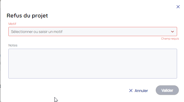 au clic sur Refuser le projet : ouverture d'une pop up pour en saisir le motif.