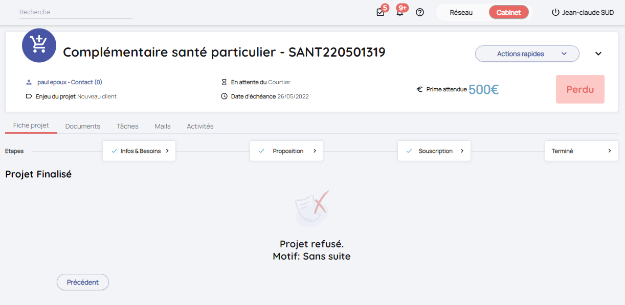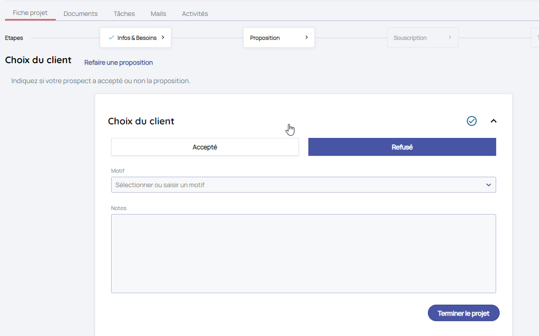 Dans le cadre d'un projet, il possible de refuser le projet, si aucun devis n'est trouvé ou si le client refuse l'offre en cours. Toutefois, il est possible, à tout moment, de refuser un projet par les actions rapides