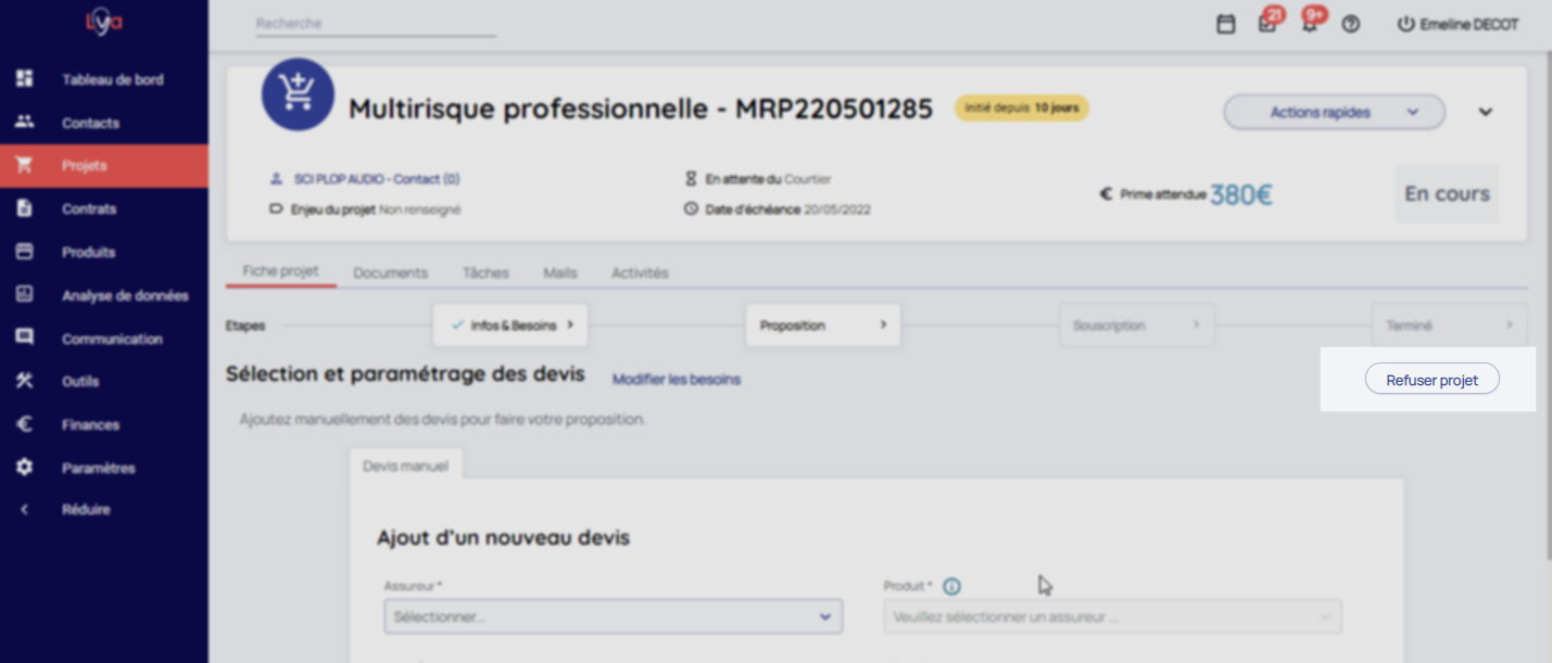 Pour vous permettre de mettre fin au projet, depuis l'écran de saisie des devis, le bouton "Refuser projet" permet de mettre fin au projet.