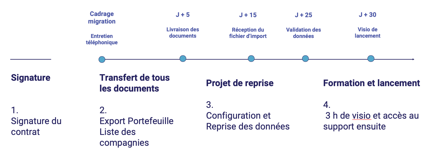 Suite à votre accord, nous avons le déroulement suivant pour gérer le projet de reprise de vos données.