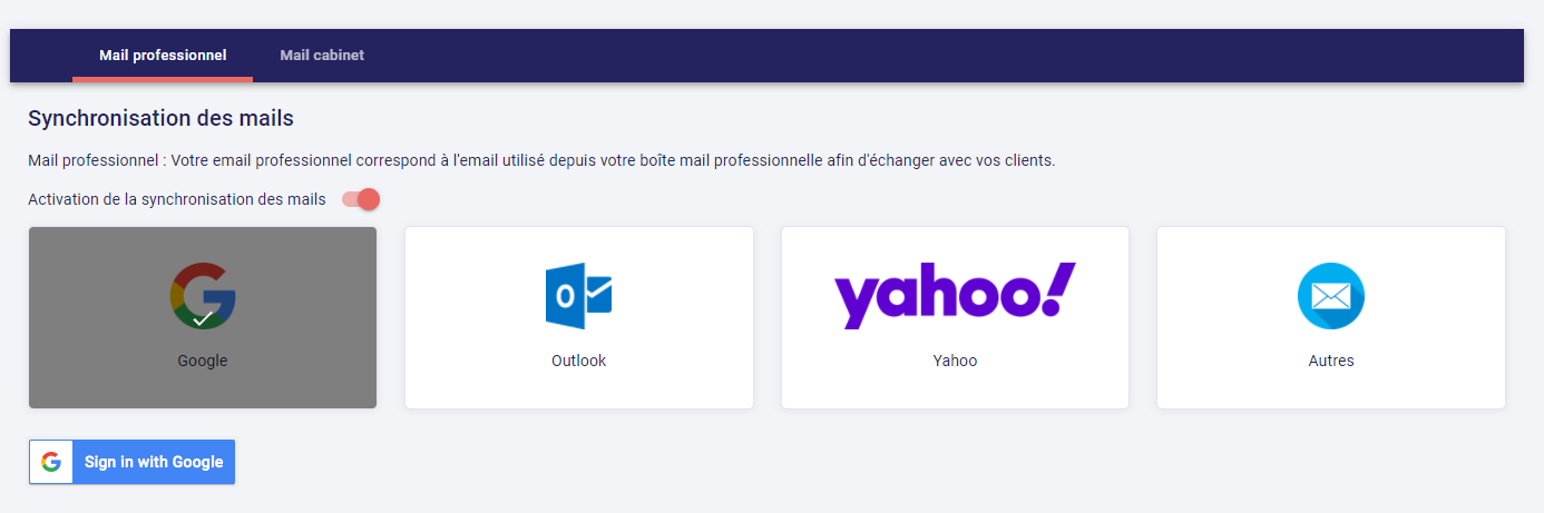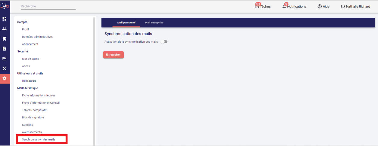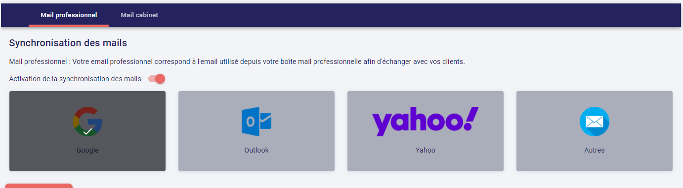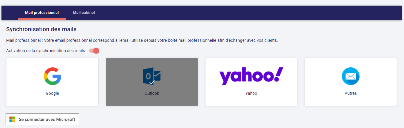 Seule une personne ayant le statut d' Administrateur dans Lya peut paramétrer une boîte mail Entreprise. Vous ne pouvez pas connecter la même adresse mail dans l'onglet Mail professionnel et Mail Cabinet sinon la synchronisation ne fonctionnera pas.