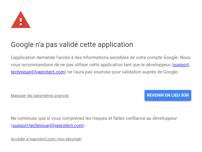 Dans ce cas-là, cliquez sur Paramètres avancés, puis Accèdez à lyaprotect.com (non sécurisé) :