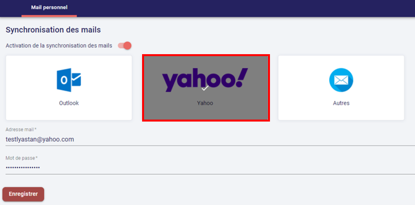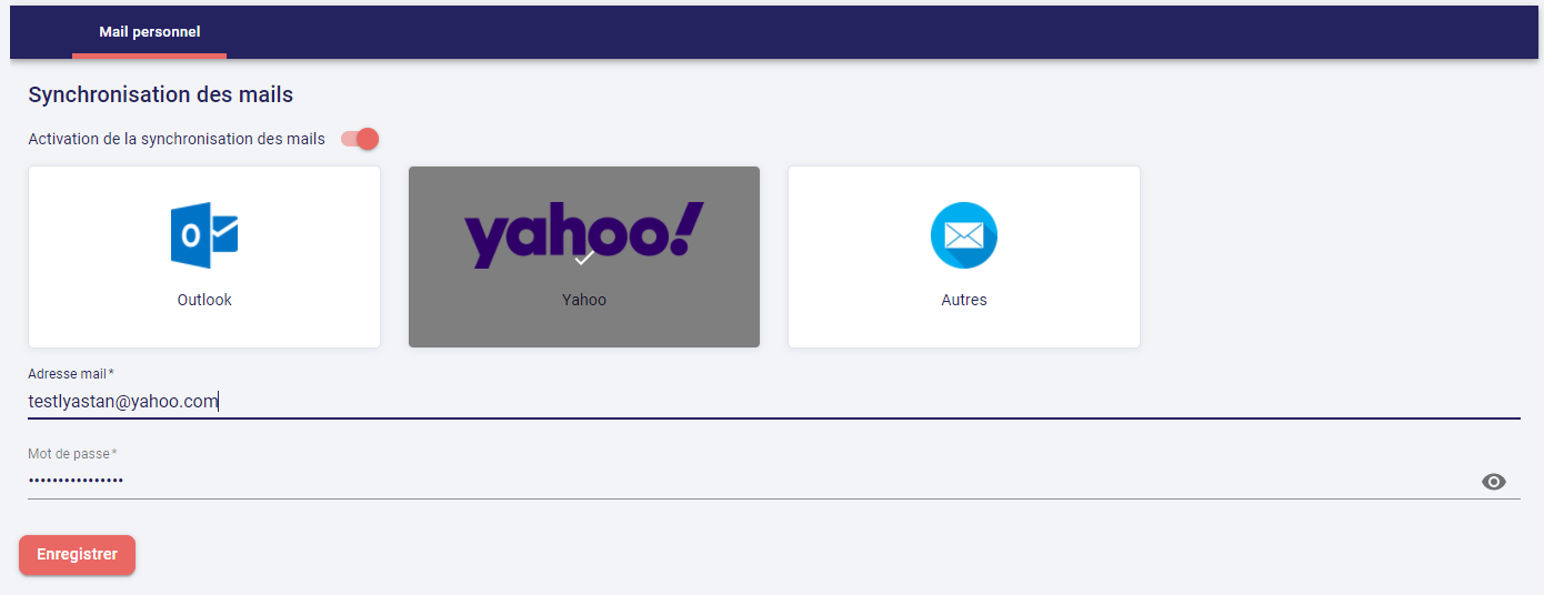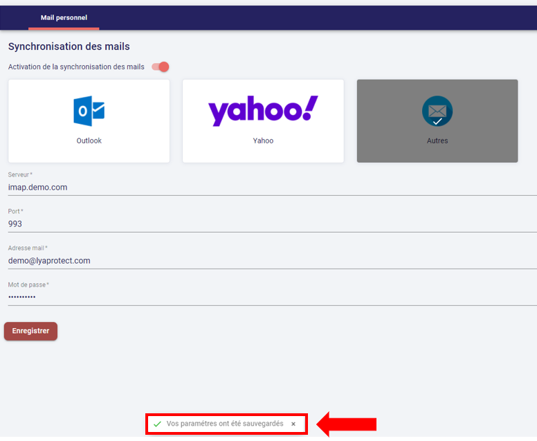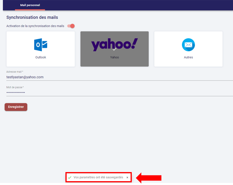 - Si vous souhaitez modifier la boîte mail connectée, vous devez saisir les nouvelles informations et cliquez sur Enregistrer.