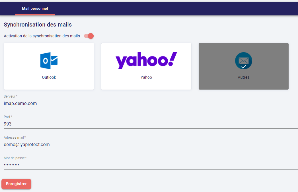 Pour paramétrer votre boite mail dans Lya, nous vous invitons à contacter le support par email à support@lyaprotect.com ou par téléphone au +33 4 81 68 27 05.