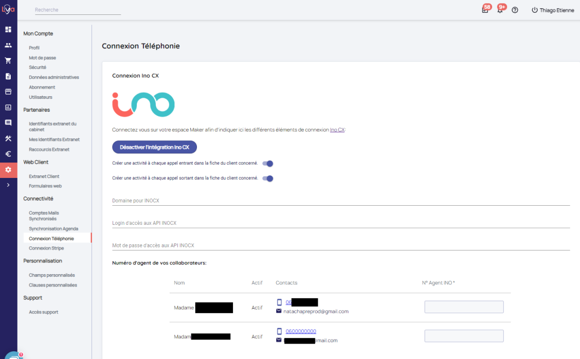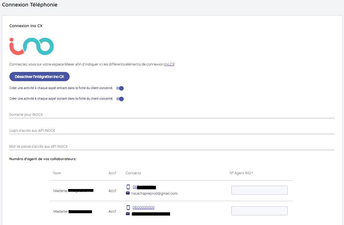 Synchronisation d'un compte de téléphonie Ino CX et montée de fiches client