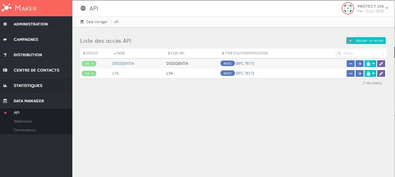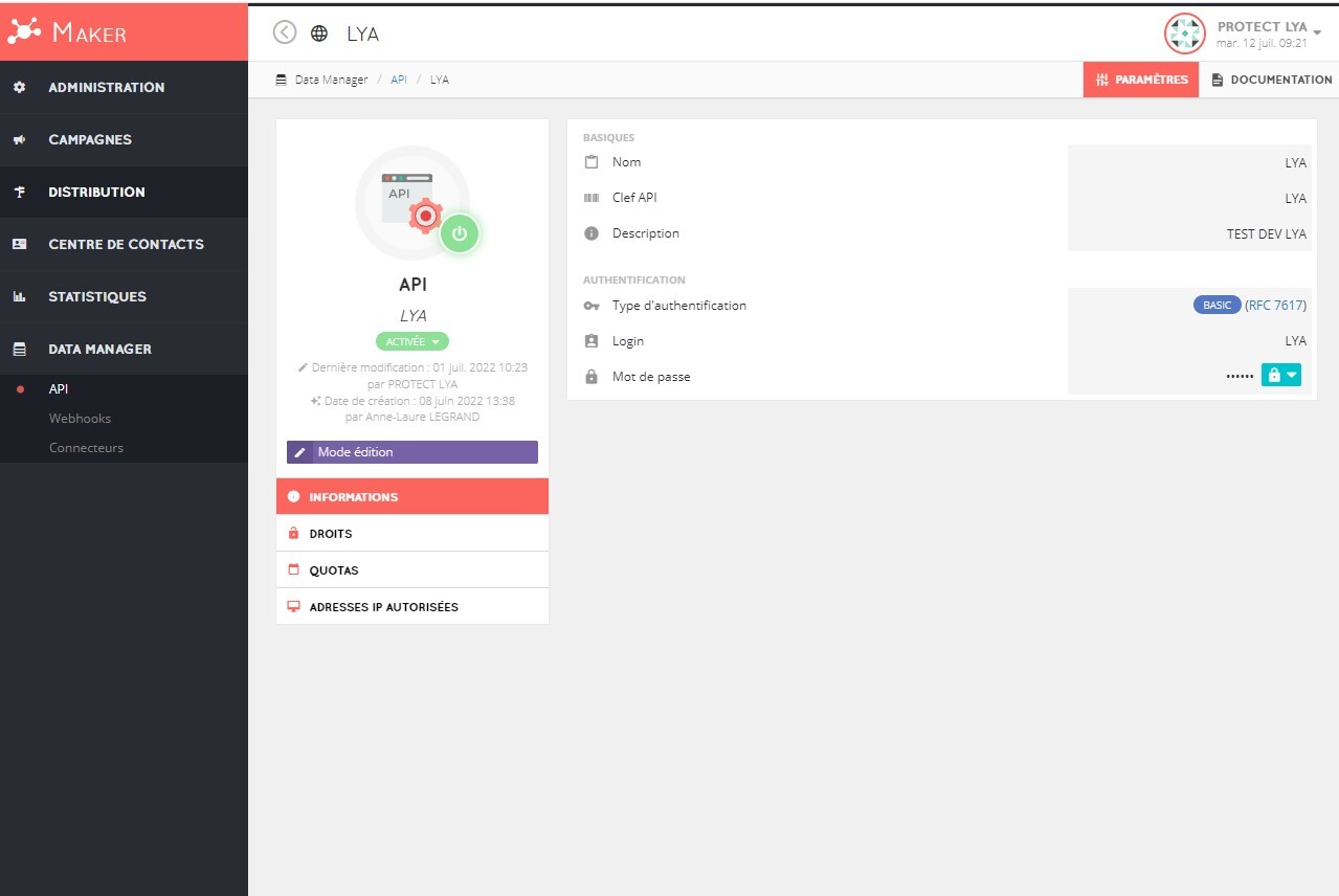 - Récupérer le login et mot de passe dans le menu DATA MANAGER > API :