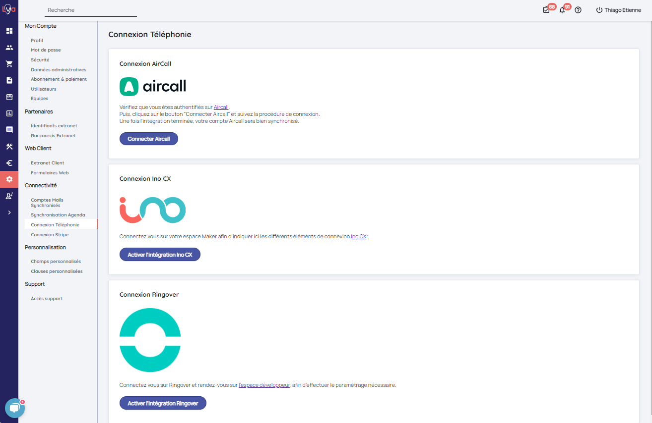 Afin de bénéficier de la synchronisation téléphonique, il convient de souscrire un abonnement Ringover (formule minimum : business). Contactez-nous pour savoir comment le connecter à Lya.