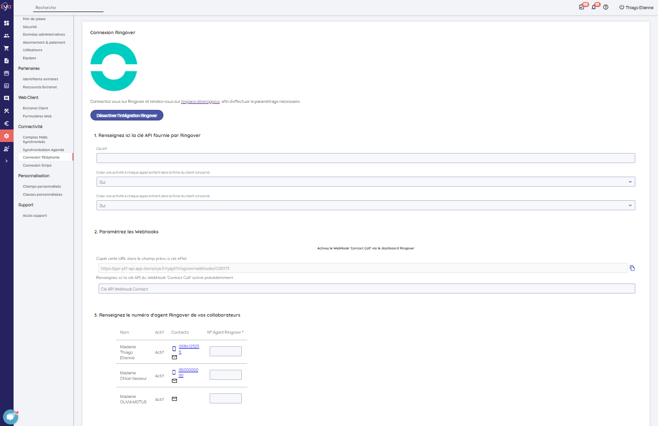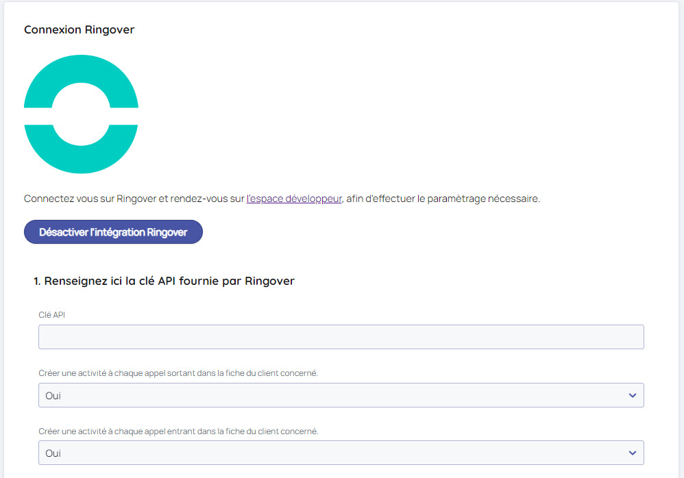 Dans Lya cliquez que Activer l'intégration Ringover afin de compléter les données de paramétrages récupérés depuis votre compte Ringover.