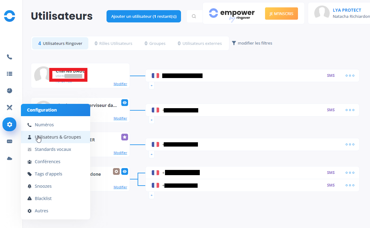 Depuis Ringover, copier le numéro à 7 chiffres (après USER) en allant dans Configuration > Utilisateurs et groupes.