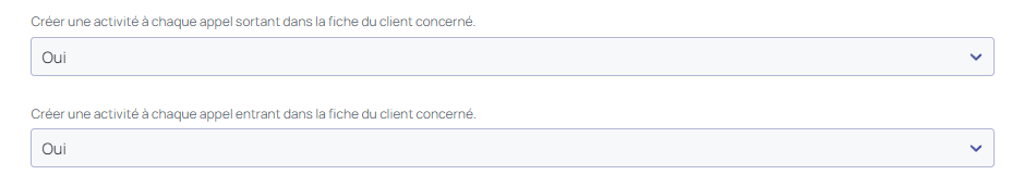 A défaut, si vous ne souhaitez pas tracer les appels dans vos activités, vous pouvez décocher les cases. Attention, si vous voulez historiser un appel sortant ou entrant, vous devrez le faire manuellement en créant une activité depuis la fiche client.