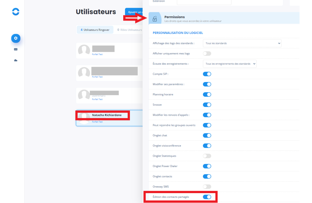 1/ Depuis l'utilisateur, allez dans Permissions pour activer les éditions de contacts partagés.