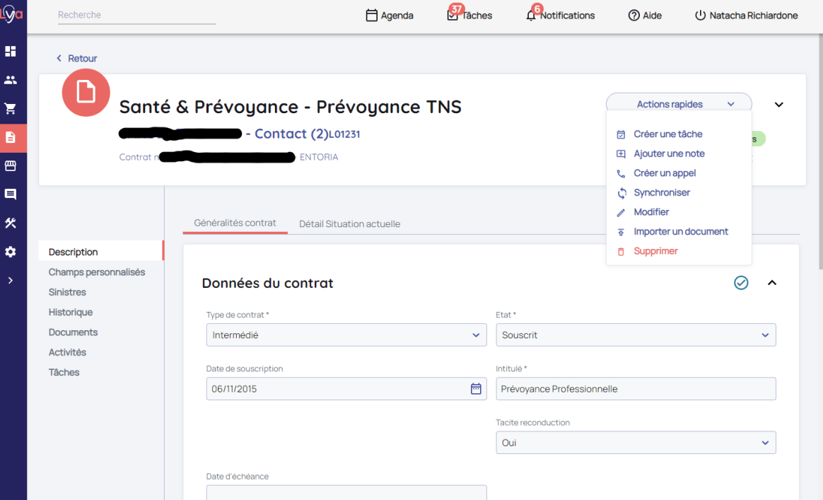 La synchronisation unitaire d'un contrat est accessible depuis le bouton Actions rapides dans le header principal d'une fiche contrat.