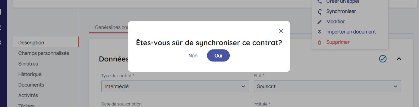 Rendez vous dans la fiche du contrat que vous souhaitez synchroniser", puis dans le menu "Actions rapides", cliquez sur "Synchroniser".