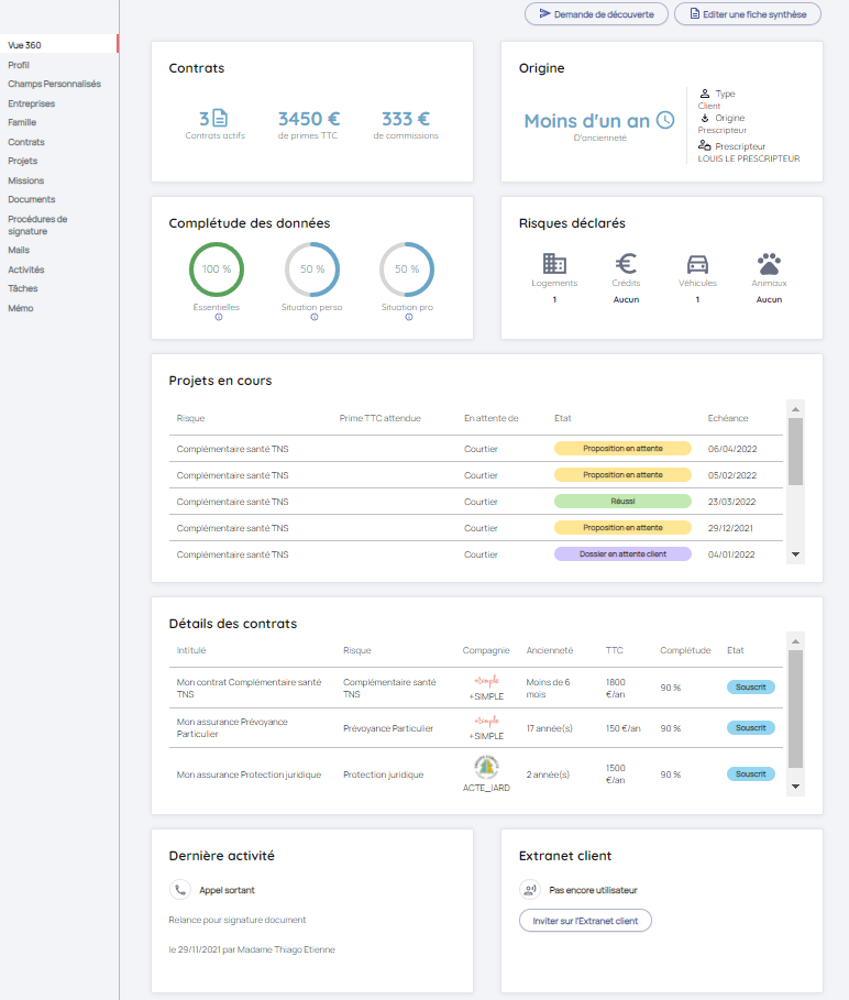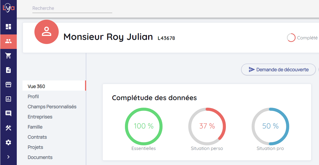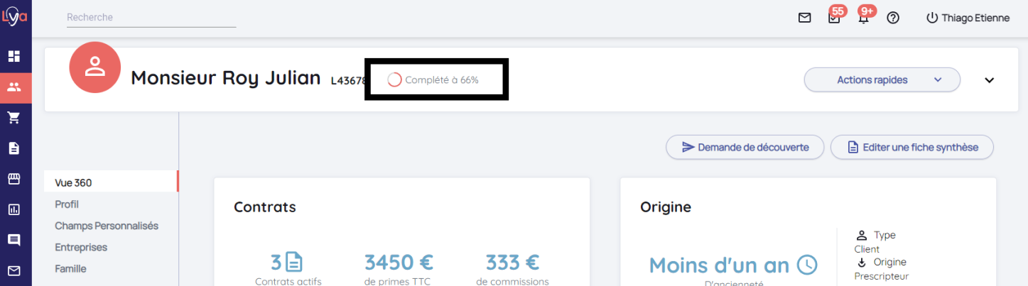 L'onglet Vue 360 d'une fiche Contact Personne vous permet d'avoir en un écran les informations principales sur votre client, le pourcentage de complétude sa fiche ainsi que des boutons d'actions rapides.
