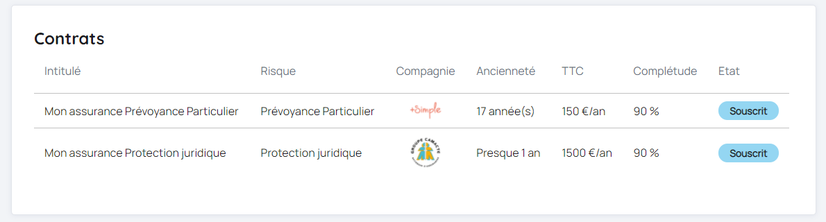 Cet encart affiche la liste des contrats intermédiés et en cours pour lequel le client est souscripteur ou bénéficiaire. Sont mentionnées les informations suivantes :
