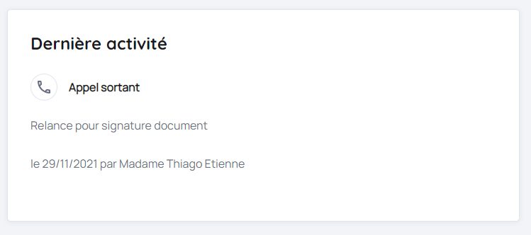 Cet encart affiche la dernière activité réalisée pour le client concerné. Sont mentionnés le type d'activité, l'objet, la date ainsi que le collaborateur ayant effectué l'activité.