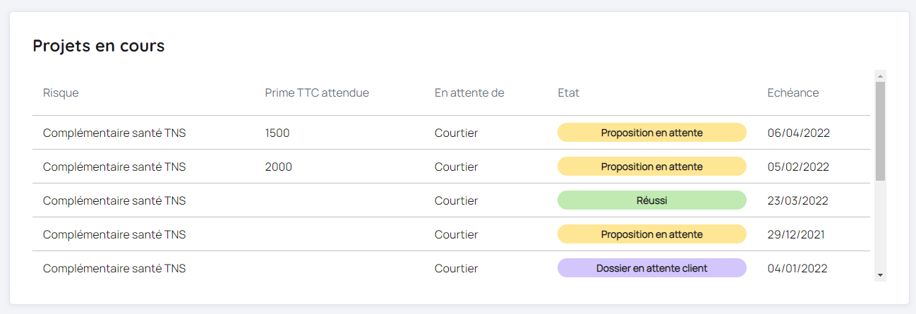 Cet encart affiche les projets du client avec les informations sur la typologie, la prime attendue, l'action attendue, l'état et l'échéance.