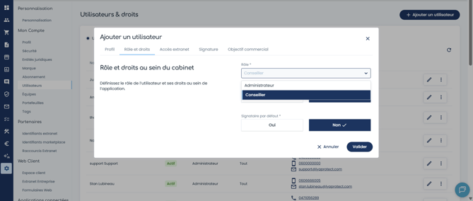 Résultat attendu : Les droits sont appliqués instantanément. Le collaborateur verra son interface s'adapter (menus masqués) selon son profil lors de sa prochaine connexion.